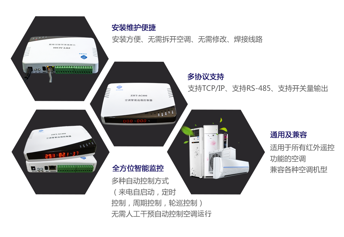 ZHT-AC800 網(wǎng)絡型空調智能啟動控制器,利用 PC 機控制軟件,通過網(wǎng)絡或 RS485 與設備進行通訊,可實現(xiàn)上百臺空調的集中聯(lián)網(wǎng)控制。通過學習空調遙控器的空調的開啟和關閉、工作模式、溫度調整等紅外信號,實現(xiàn)空 調斷電再來電自動啟動,并開啟到用戶需要的運行模式,同時具備溫度檢測控制功能,按用 戶配置的溫度值,當環(huán)境溫度達到設定值后,自動開啟和關閉空調,兼容市面上各種品牌柜式機、分體壁掛機、吸頂式機等各 種空調機機型。