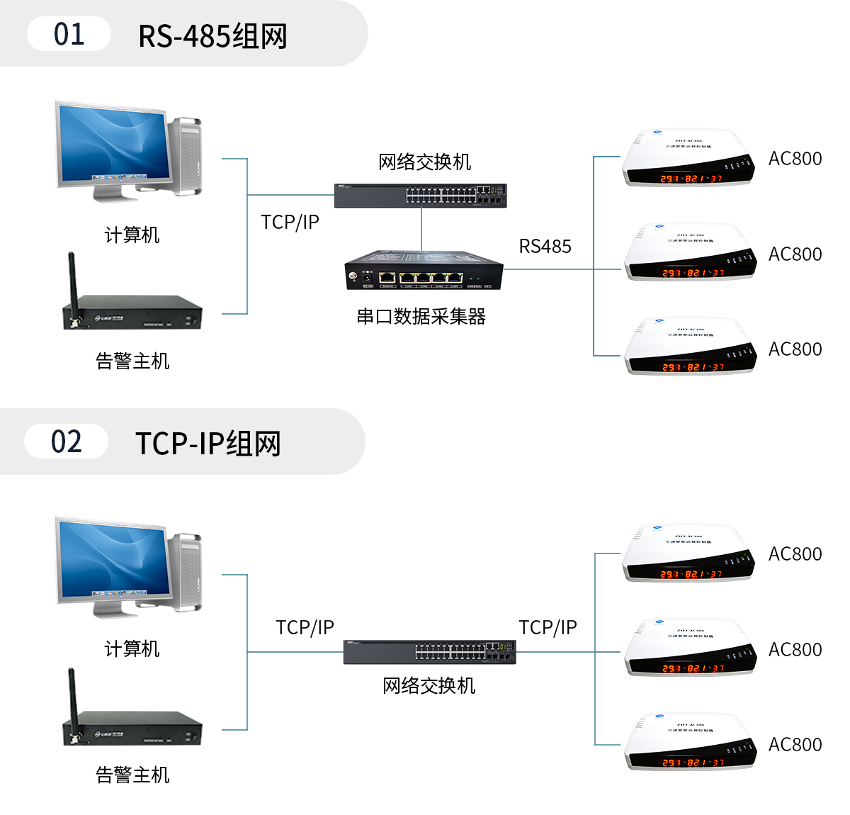 ZHT-AC800 網(wǎng)絡型空調智能啟動控制器,內置網(wǎng)絡及RS485通訊接口,可使用TCP/IP組網(wǎng)和RS485總線連接方式組網(wǎng),可根據(jù)空調現(xiàn)場的位置分布靈活選擇組網(wǎng)方式,實現(xiàn)遠程集中管理所有空調。其系統(tǒng)組網(wǎng)圖如左圖所示。