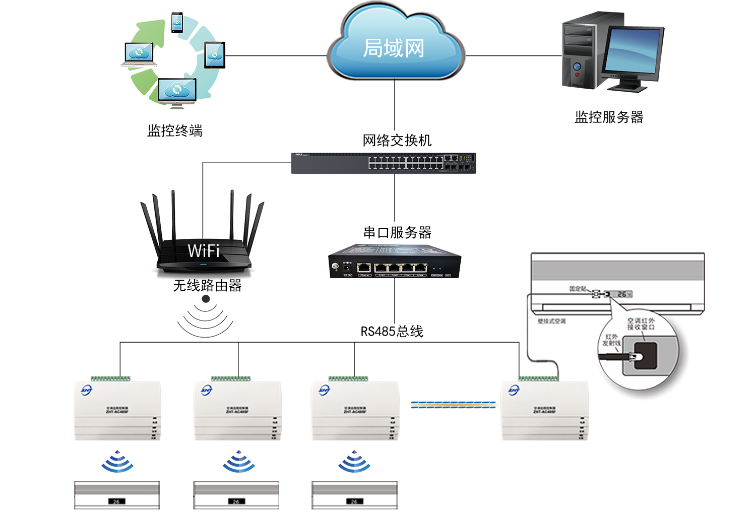 ZHT-AC485F空調遠程控制器內置WiFi通訊模塊和RS485通信接口,可直接使用WiFi連接進行空調控制器的參數(shù)配置及數(shù)據(jù)采集,同時對于有線連接便捷的場景,也可直接使用485總線連接,實現(xiàn)空調的遠程集中控制、安裝維護簡單方便,其系統(tǒng)組網圖如左側所示。