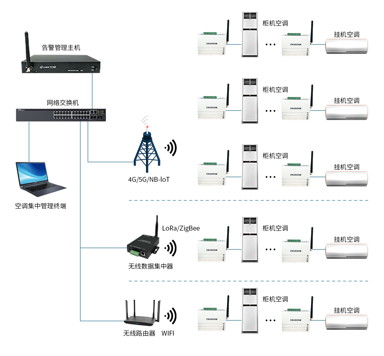 ZHT-AC485F系列無線空調(diào)控制器支持:4G/5G/WiFi/LoRa/ZigBee/NB-IoT等常見的無線通訊模塊,適用于不方便布線或布線距離超長的場景,實現(xiàn)空調(diào)的遠程集中控制、安裝維護簡單方便,其系統(tǒng)拓撲圖右側(cè)所示: